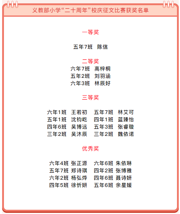 为庆祝漳州立人学校建校20周年,营造浓厚的校庆氛围,给广大师生校友一个展示自我、抒发尊师爱校情怀的平台,校庆筹备组特组织本次征文比赛活动。广大师生校友积极响应,热情参与,佳作频出。经组委会公平公正慎重评选,一批优秀作品脱颖而出获奖,现将获奖名单公布如下: